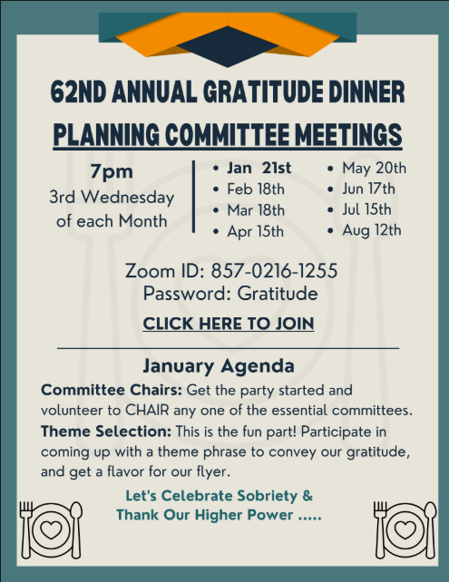 Get the party started and volunteer to participate in Chairing one of the essential committees for the 62nd Annual Gratitude Dinner to benefit the General Service Board.